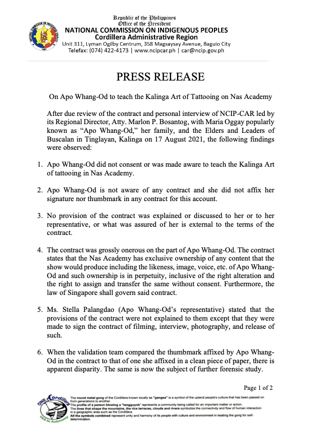 In the evening of Sunday, the 29th of August 2021, the National Commission on Indigenous Peoples – Cordillera Administrative Region, an agency of the Philippine Government that is supposed to protect the interests and well-being of indigenous cultural minorities in the Philippines, issued a Press Release which essentially denied that Apo Whang-Od gave her consent to be featured on Nas Academy and shockingly even denied that Apo Whang-Od had affixed her thumbprint upon the Nas Academy contract.