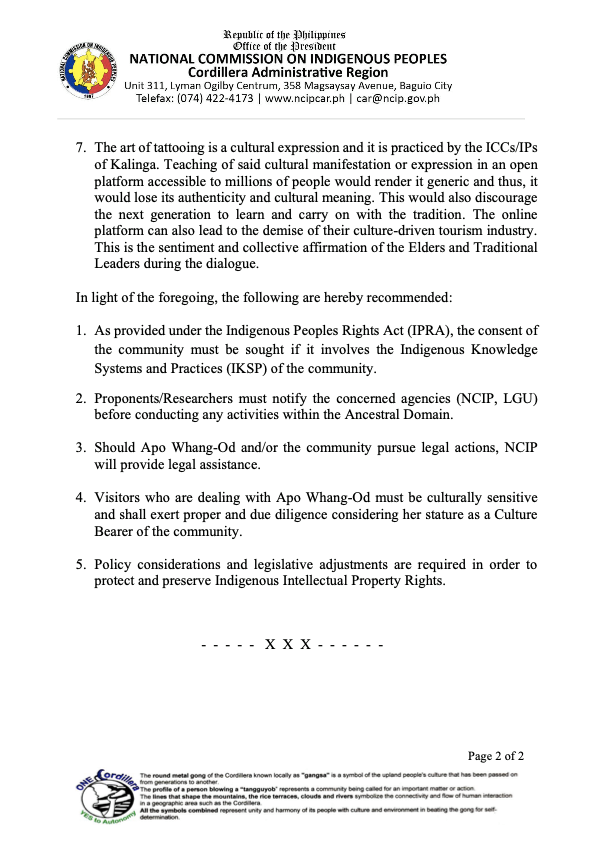 Statement number 7: “The art of tattooing is a cultural expression and it is practiced by the ICCs (Indigenous Cultural Communities)/IPs (Indigenous Peoples) of Kalinga. Teaching of said cultural manifestation or expression in an open platform accessible to millions of people would render it generic and thus, it would lose its authenticity and cultural meaning. This would also discourage the next generation to learn and carry on with the tradition. The online platform can also lead to the demise of their culture-driven tourism industry. This is the sentiment and collective affirmation of the Elders and Traditional Leaders during the dialogue.”