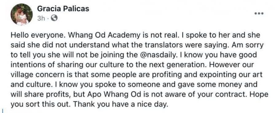 At every step of the way, Nas Academy had the facts on their side. They had a video which proved that Apo Whang-Od did in fact willingly thumbmark a Nas Academy contract, belying Gracia’s initial claim that her “grandmother did not sign any contract.” They also named who the primary “translator” was, and that person turned out to be Estella Palangdao – a niece of Whang-Od – who is also a relative of Gracia.