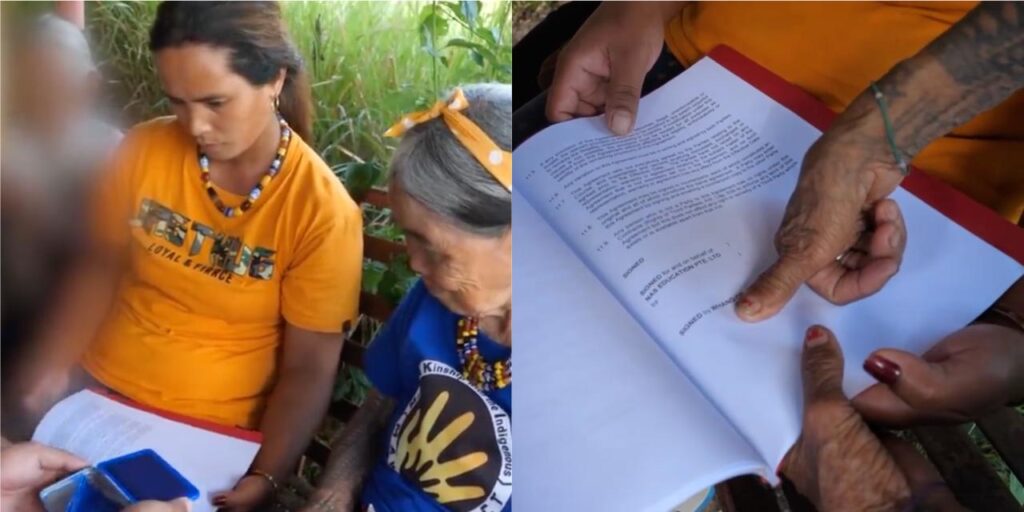 This is despite actual documentary evidence captured on video which shows her willingly affixing her thumbprint upon a contract after a tattooed woman in orange (her trusted niece and designated representative, Ms. Estella Palangdao) is shown speaking to Apo Whang-Od in the local Butbut dialect of the Kalinga language and gesturing as to where on the contract she is to affix her thumbprint.